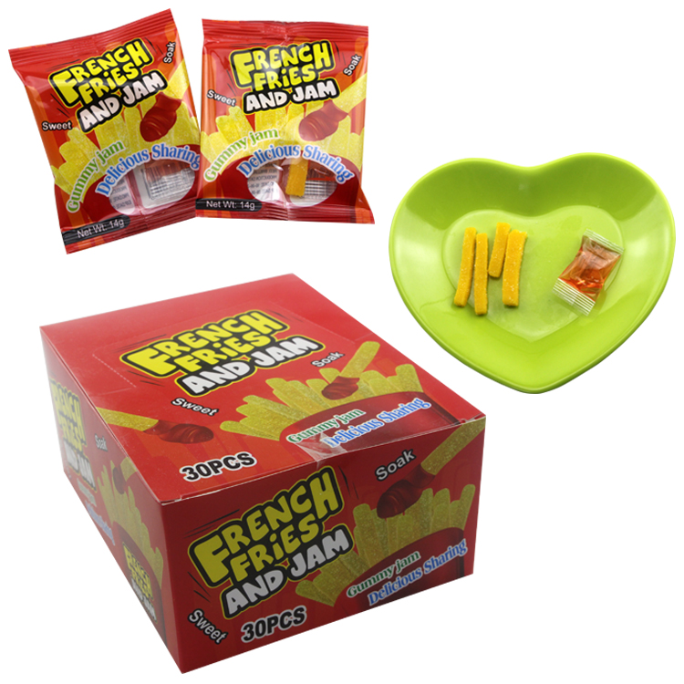 Hot Selling Delicious Fries Shape Fruit Flavour Sweet Gummy Soft Candy with Fruit Jam Candy